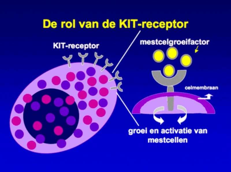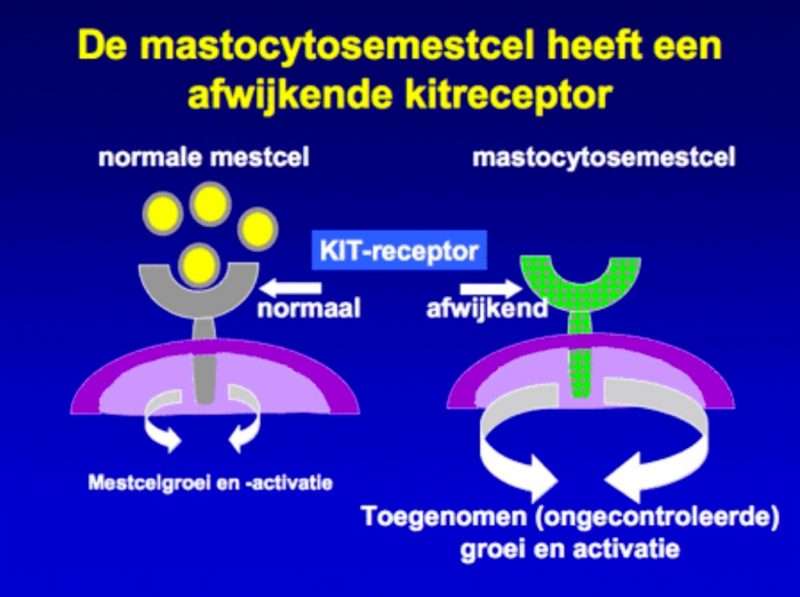 Bij mastocytose treedt er een afwijking op in de mestcellen. Op één plaats in de KIT-receptor is een stukje veranderd, waardoor deze receptor per ongeluk signalen doorgeeft zonder dat er contact met mestcelgroeifactoren is geweest.